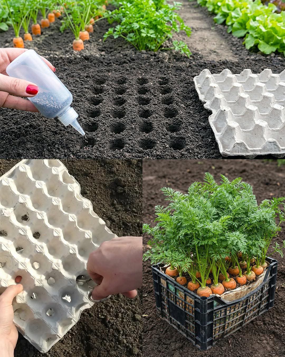 Cardboard egg trays are surprisingly useful in the garden. Their evenly spaced cells help create consistent planting distances, which is especially important for root vegetables like carrots. Proper spacing gives each root enough room to grow straight and full without crowding.