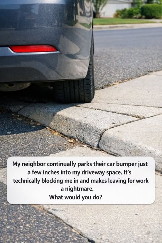 My neighbor continually parks their car bumper just a few inches into my driveway space. It’s technically blocking me in and makes leaving for work a nightmare. What would you do?