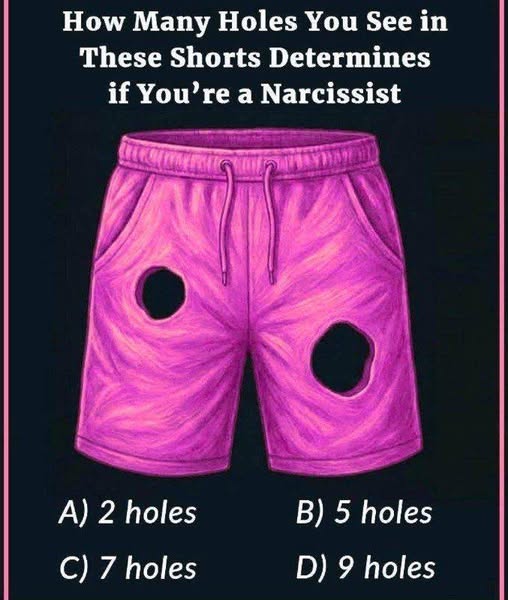 At first glance, this viral image seems like nothing more than a pair of damaged shorts. But the moment you read the title—“How many holes you see in these shorts determines if you’re a narcissist”—your brain immediately switches from passive scrolling to analytical mode. And that’s exactly why this optical puzzle has taken over social media: it challenges your perception while teasing your ego.